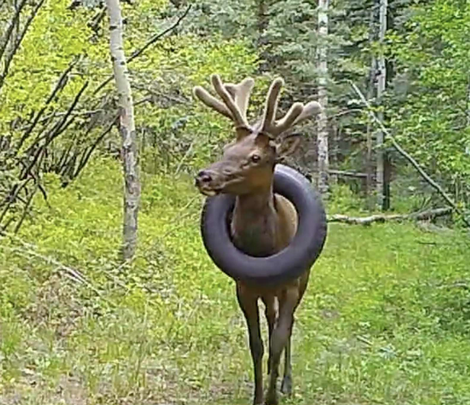 2023年08月17日在過去的2年多時間裡,美國科羅拉多州一隻麋鹿的脖子上一直套著一隻輪胎。野生動物管理局想要幫牠將輪胎取下來,但牠非常警惕,每次看到人類就逃跑。最近救援人員終於找到機會,成功幫那隻麋鹿移除輪胎,從此之後牠就自由了~