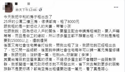 原po表示,他有一間25坪的3房公寓,前幾天以8000元的價格租給了一對夫妻。當時那對夫妻帶著小孩,邊流淚邊對他說:「因為是低收入戶關係,再加上做工的緣故,很多屋主都不願意出租,不然就是房租要到1萬5000元以上。」