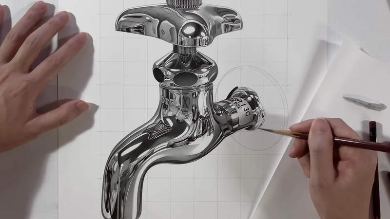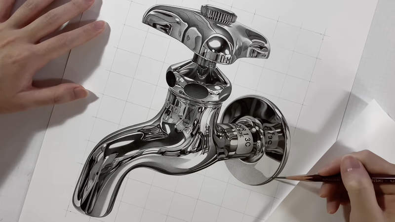 真的是平面嗎?日本寫實畫家「只用黑白」畫出水龍頭 看到手錶更誇張