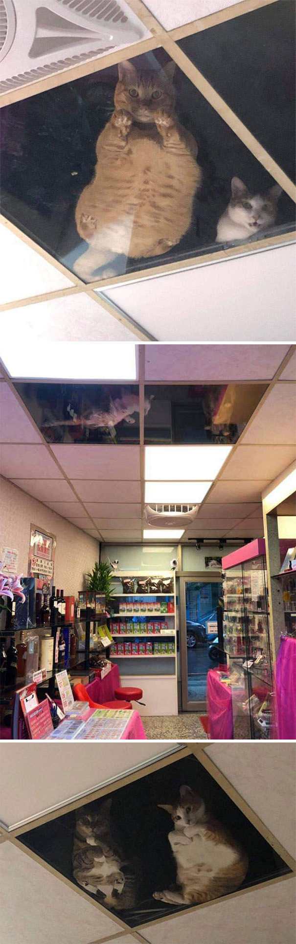 ▼店家在天花板上安裝玻璃,客人一抬頭就能看到貓咪。