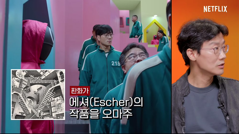 ▼《魷魚遊戲》的導演黃東赫(황동혁)表示,這一場景設計的靈感來源是荷蘭錯覺藝術大師艾雪(Maurits Cornelis Escher,M. C. Escher)1953年的作品《相對論》(Relativity)。
