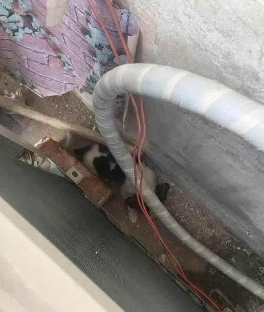 ▼狗狗不知道在縫隙裡待了多久,只能靠喝空調排水管漏出來的廢水維生。男網友看到後非常著急,來不及多想就側身跳下去,將狗狗救了上來。