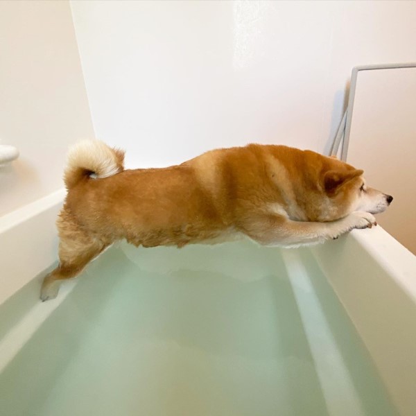 以全身拒絕!柴柴不想洗澡「棒式撐浴缸」 網笑翻:好強的腰力!