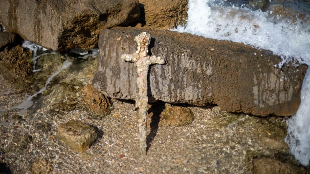 ▼以色列文物局督察人員Nir Distelfeld說:「這把劍保存完好,非常美麗,也非常罕見。它原本屬於一名十字軍騎士。剛剛被發現時,劍身上覆滿了海洋生物,但毫無疑問它是鐵製的。這一發現令人振奮,因為這把劍能帶我們回到900年前的不同時代,那個時代有著騎士、盔甲、劍。」