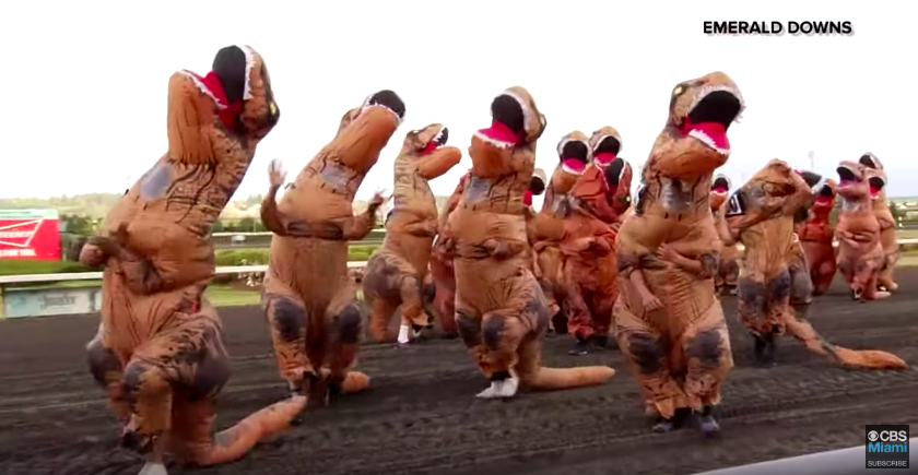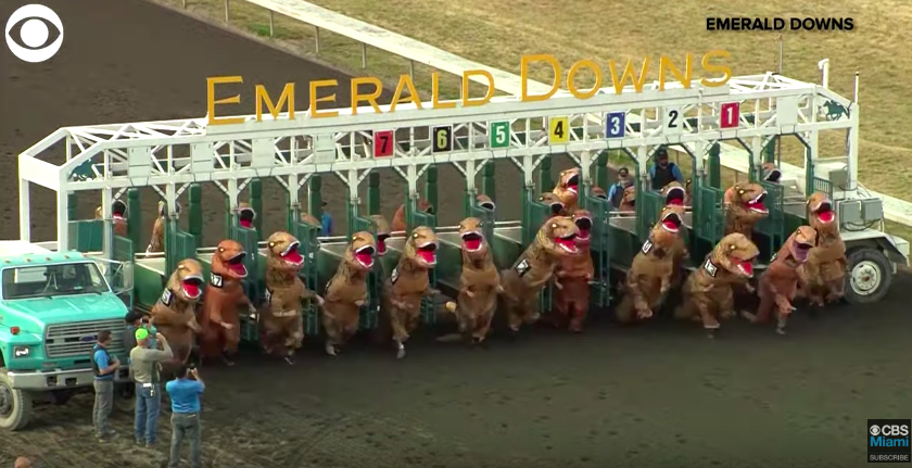 2021年10月22日賽馬比賽不罕見,那恐龍比賽呢?不要懷疑,世界上真的有這麼無厘頭的比賽!去年7月初,美國華盛頓州奧本市(Auburn)舉辦了一場超有趣的賽跑比賽,參賽者都穿著充氣霸王龍裝。不等他們奔跑,只看他們排隊準備進閘門的樣子,大家就笑翻了。