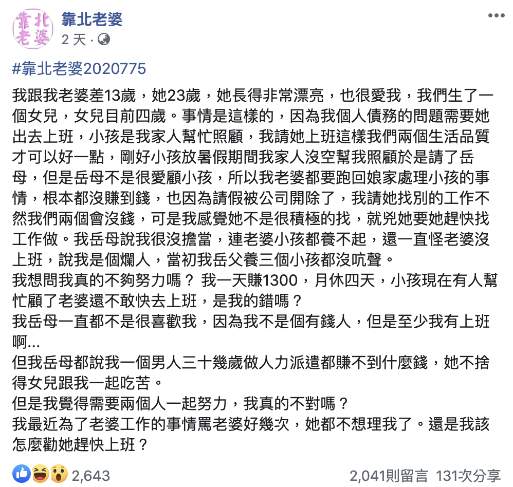 2021年10月22日婚姻需要靠雙方的維繫,一名男子匿名上臉書《靠北老婆》粉專發文表示,他的太太23歲比自己小13歲,長得漂亮也很愛他,他們之間有一位4歲的女兒。男子表示因為自身有債務,所以很希望太太能出去工作,來提高生活品質,「我最近為了老婆工作的事情罵老婆好幾次,她都不想理我了。還是我該怎麼勸她趕快上班?」