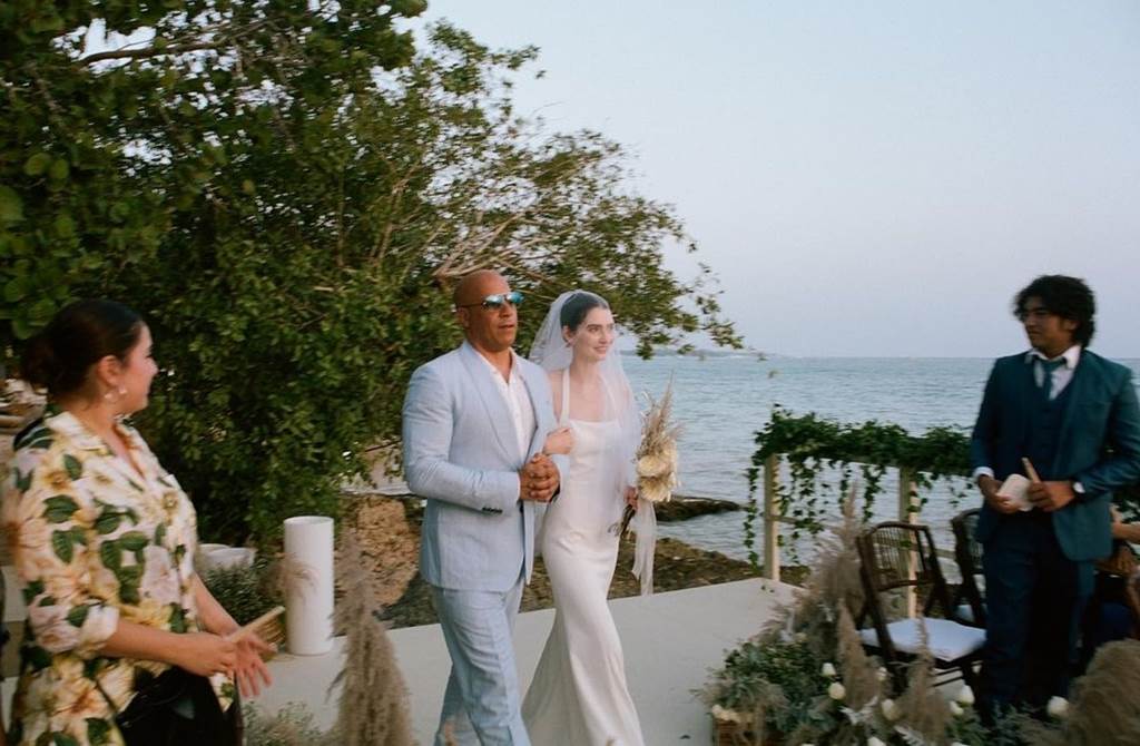梅朵穿著細肩帶露手臂禮服,頭戴白紗,在馮迪索的牽引下緩緩入場。梅朵和老公離場時,眾人大撒花瓣祝福。他們將婚禮照片po到網路上後,引來很多親友留言賀喜,「神力女超人」蓋兒加朵(Gal Gadot)也留下愛心符號,祝福這對新人百年好合~