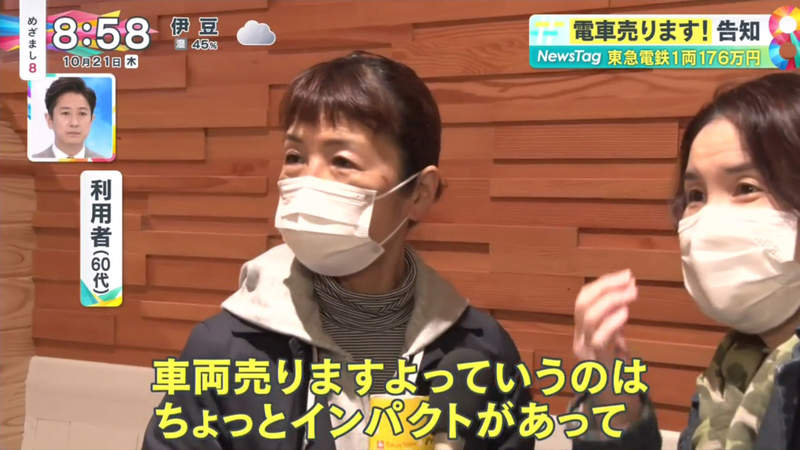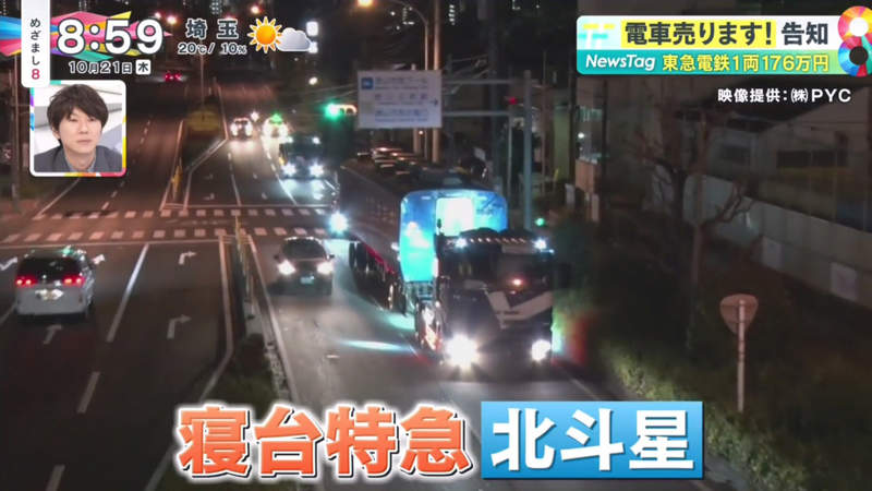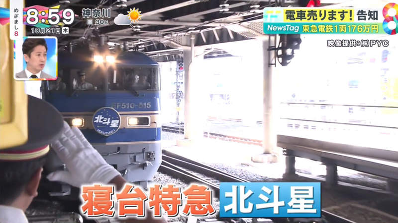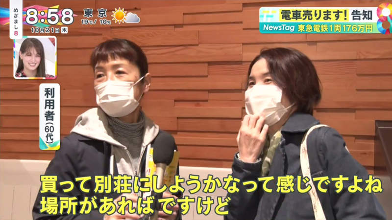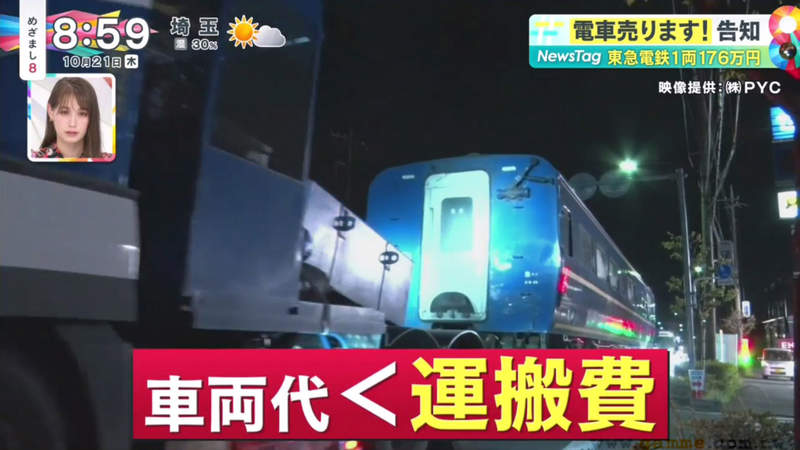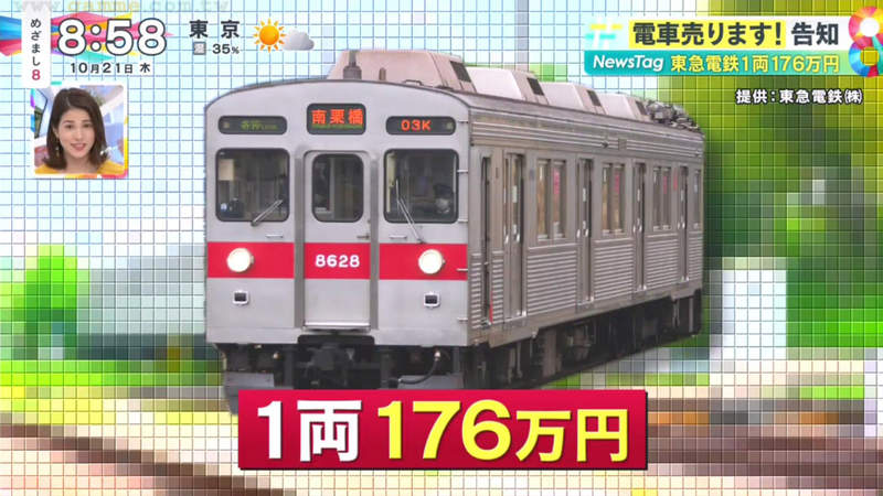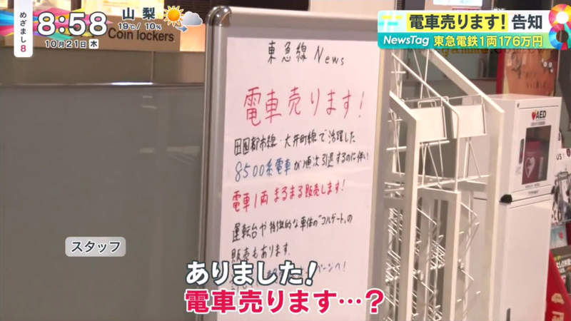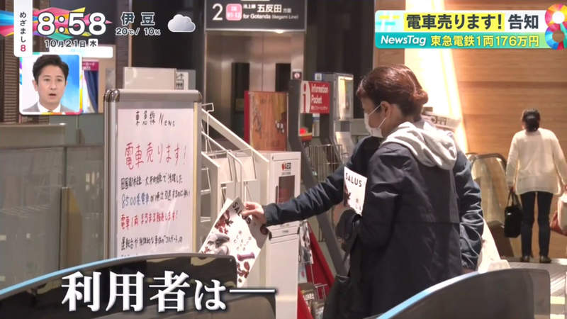 ▼富士電視台的晨間情報節目「めざまし8」來到東急電鐵的池上車站,發現車站中有一張告示,上面寫著:「販賣電車!車廂整個出售!」