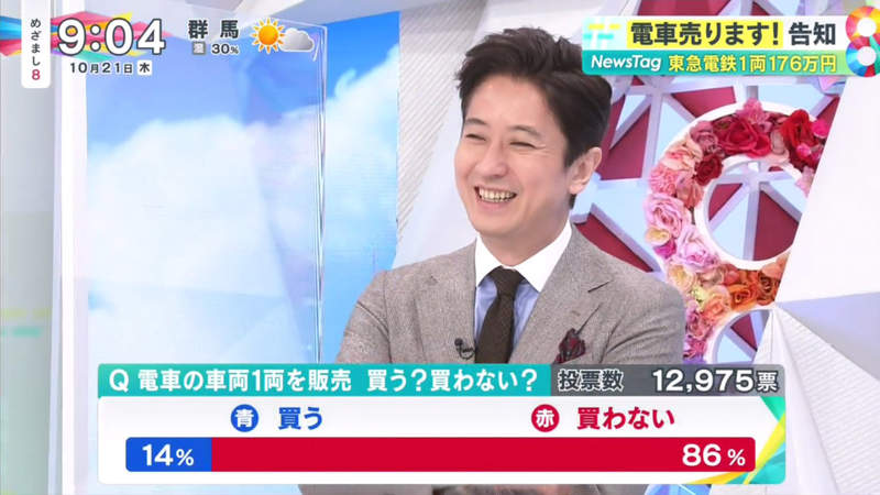▼「めざまし8」在現場直播時詢問觀眾會不會買車廂,觀眾透過遙控器投票,結果12,975人當中,有86%表示不會買。