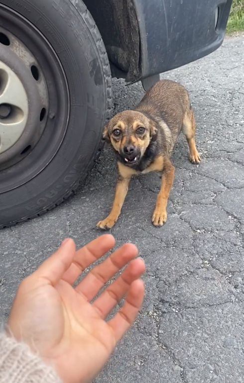 ▼Neagu停車後,狗狗很快就跑到輪胎邊。但Neagu伸手想要查看牠的情況時,牠卻本能地畏縮並露出牙齒警告。Neagu救援經驗豐富,知道這隻狗狗的表現是因為曾被傷害過。她耐心地一點點靠近狗狗,希望牠能信任自己、接納自己。