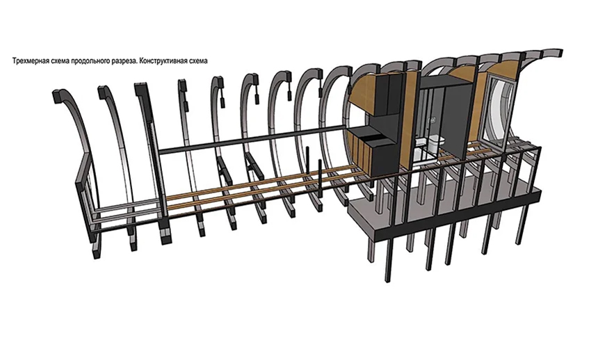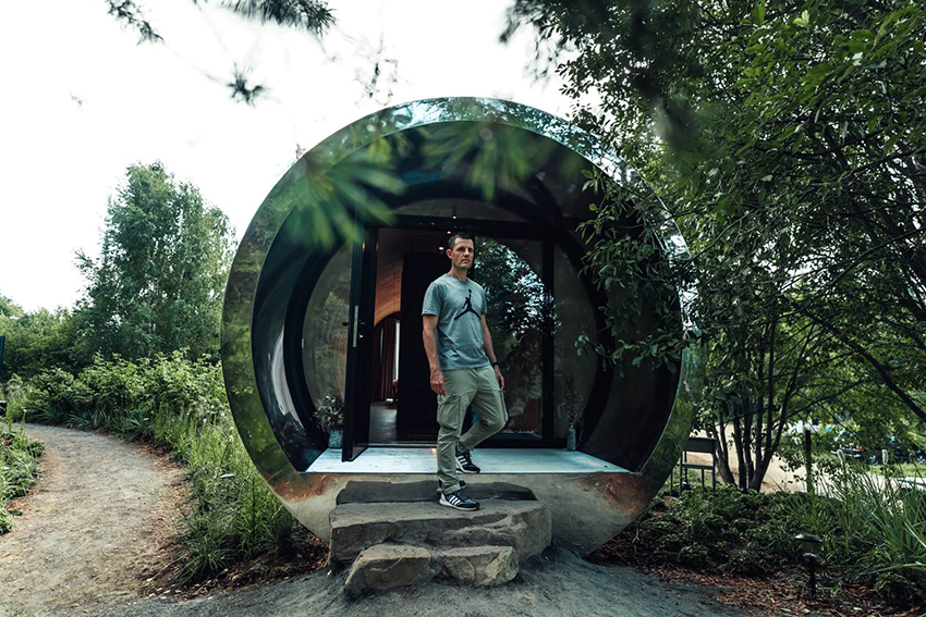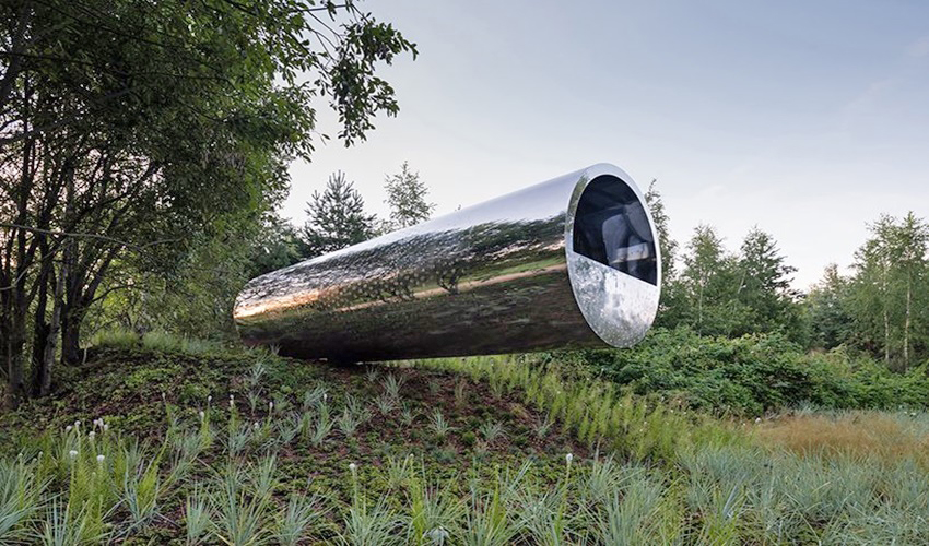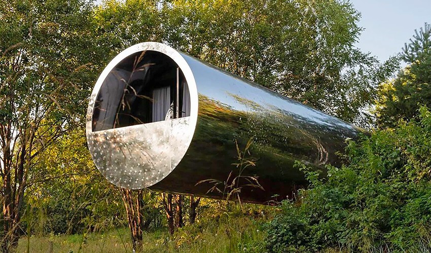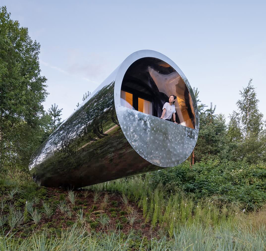 ▼這棟不鏽鋼管狀建築叫「Russian Quintessential」,是莫斯科首席建築師Sergey kuznetsov和KROST團隊共同打造的。他們透過巧妙的規劃,還有複雜的造船工法,將這段長12公尺、直徑為3.5公尺的管子變成房屋,並高懸在俄羅斯的Nikola-Lenivets大地藝術公園之中