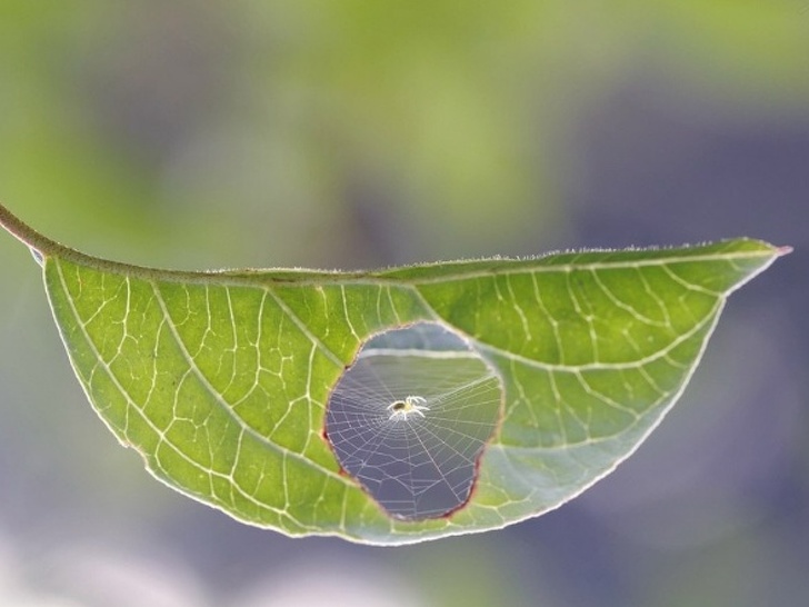 ▼15.蜘蛛修補了葉子上的洞。