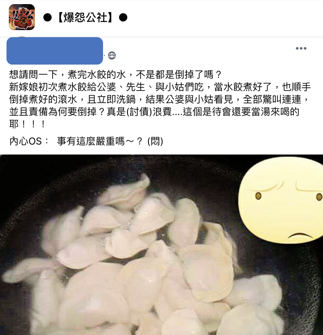 ▼原po在臉書社團表示,她實在不明白,只是倒掉水餃水而已,有必要這樣嗎?網友們看到後議論紛紛,有人力挺原PO認為夫家大驚小怪:「太大驚小怪,確實有人會喝煮水餃湯,就算倒掉也不會怎樣吧!」
