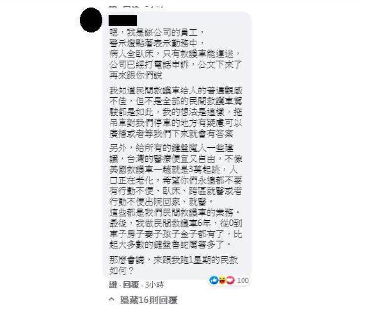 ▼救護車業者並不認同這樣的解釋,另一位員工回應說:「我是該公司的員工,警示燈點著表示勤務中,病人全臥床,只有救護車能運送,公司已經打電話申訴,公文下來了再來跟你們說。」、「民間救護車給人的普遍觀感不佳,但不是全部的民間救護車駕駛都是如此,我的想法是這樣,拖吊車對我們停車的地方有疑慮,可以廣播或者等我們下來就會有答案。」