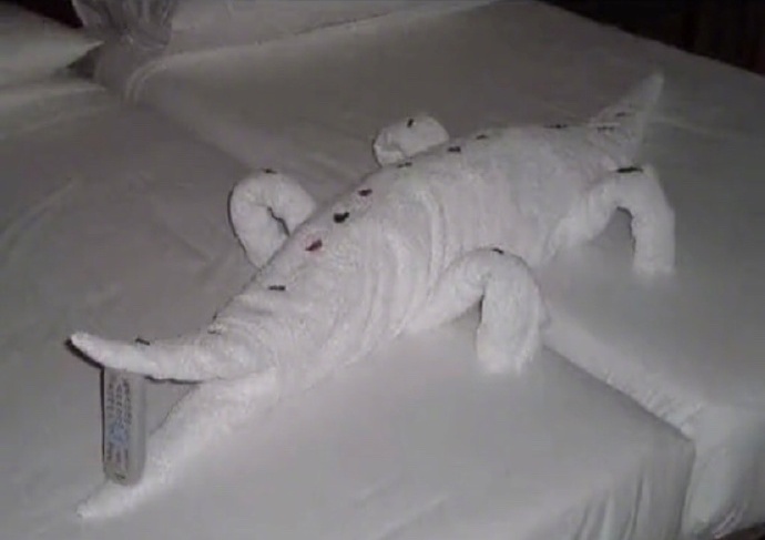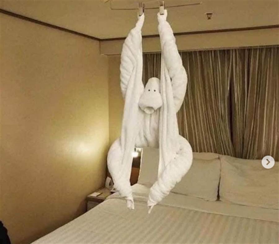 2021年10月29日出入飯店,經常能看到客房裡擺放著用浴巾折疊的可愛小動物,有些手巧的客人退房時也會折疊浴巾,給房務人員留下一份驚喜。最近一位訪客離開飯店後留下的手工作品引起了網友們的關注,大家忍不住表示:「這是猩球崛起!」