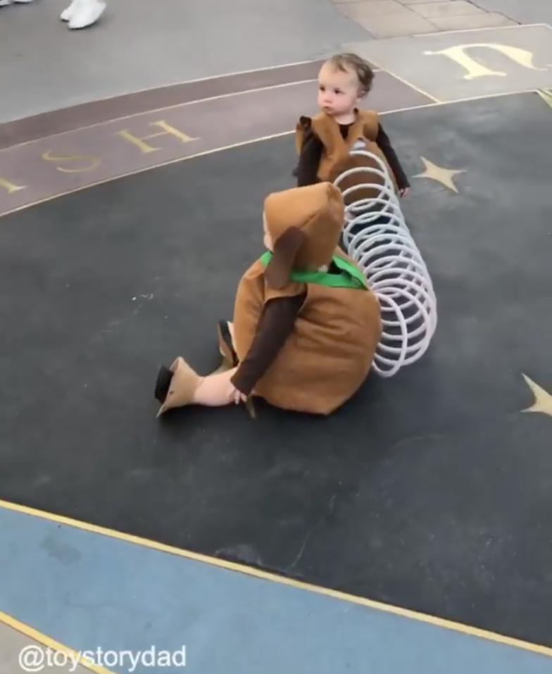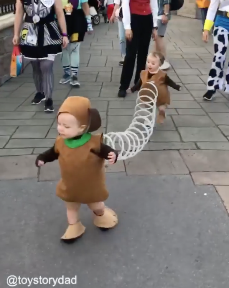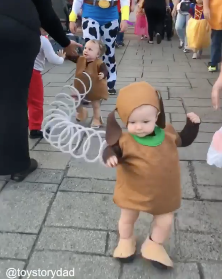 2021年10月29日這會是你今天看過最療癒的影片!外國一名熱愛《玩具總動員》的爸爸Tucker,帶寶寶去迪士尼參加萬聖節派對前突發奇想,用心地幫寶寶Cosplay成「彈簧狗」,他的朋友也很熱情地派出孩子當「尾巴」!兩個萌娃就這樣搖搖擺擺地在園區內走動,吸引了所有遊客的目光。
