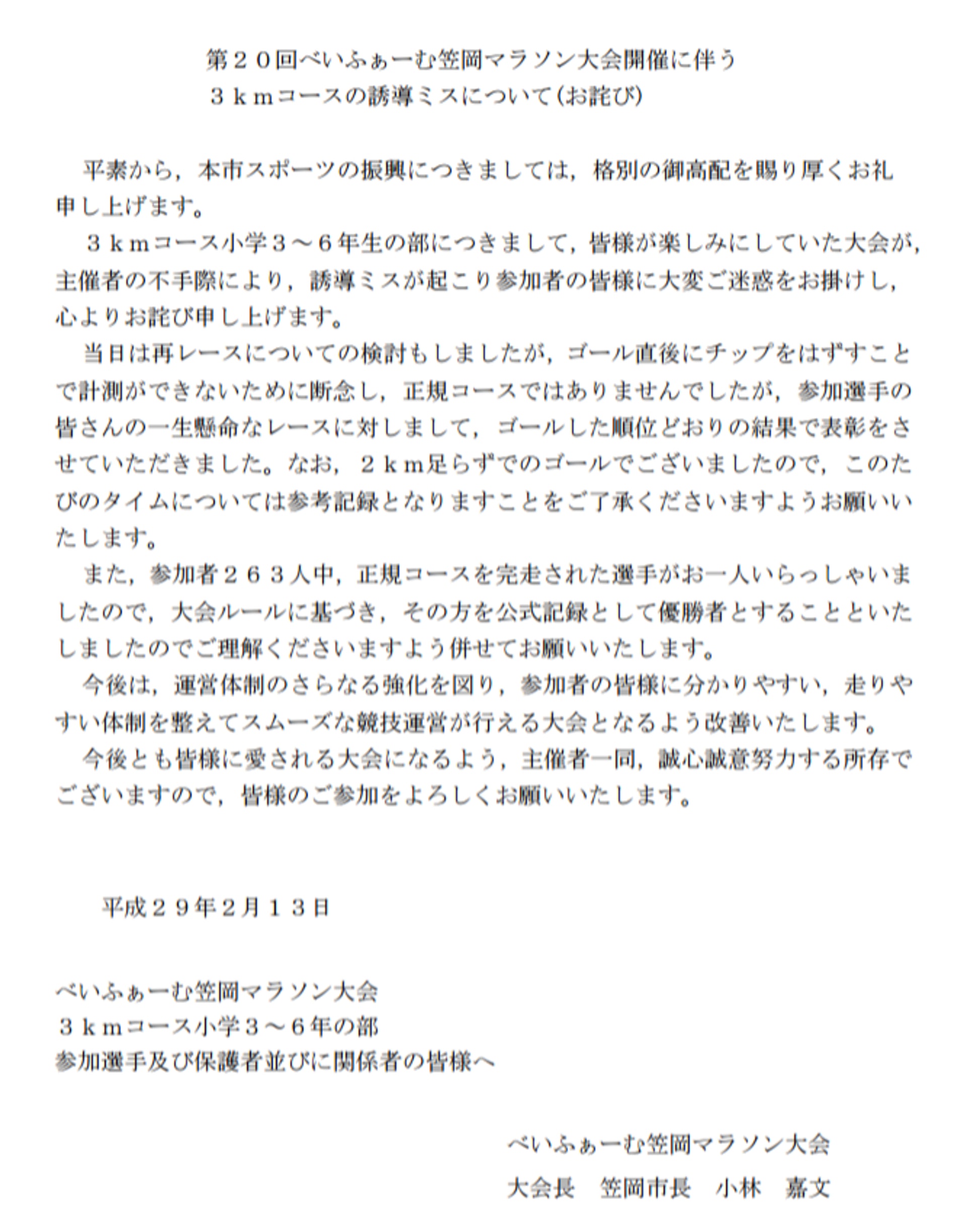 在岡山縣笠岡市舉行的這場馬拉松比賽中,小學組有263人參賽,全都是小三至小六學生。比賽過程中,在前方位置領跑的工作人員跑錯路,導致跟在他身後的262名選手全都跑錯,原本應該跑3公里,結果只跑了不到2公里。最後這些選手全都被取消資格。