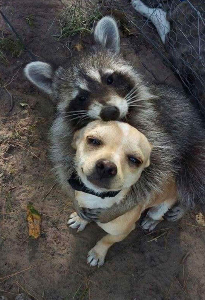 ▼2.其實不僅僅是人類,狗狗也很享受浣熊小可愛的陪伴呢!
