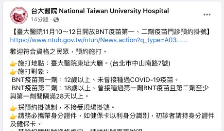 台大醫院發布公告說,自今日起新開放民眾可以自行至台大網站預約接種AZ和BNT疫苗第一劑及第二劑。因為醫院疫苗量足夠,而且醫護人力集中,已經獲得中央流行疫情指揮中心報備許可,初步安排每款疫苗各一診服務,一天可開放兩診、各200人,共400人施打。