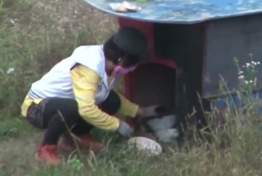 ▼救助中心得知東順的故事後,很快派工作人員來到現場,還帶來了捕捉工具,希望能將東順帶走,給牠好好檢查一下。2天沒吃東西的東順被籠子裡的肉香味吸引,輕手輕腳地走了進去,結果一下子被抓住了。
