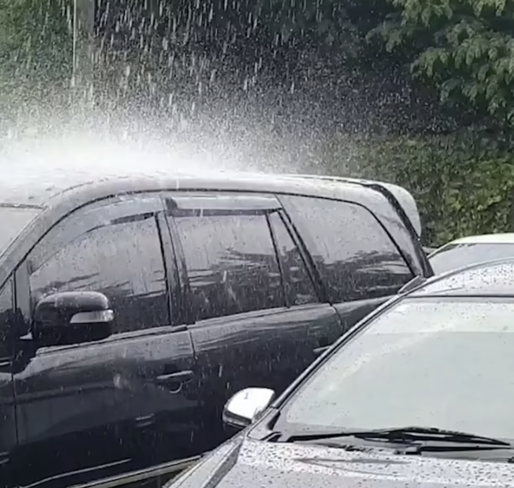 ▼10月21日,一名叫Uryan Riana的男子到芝卡朗(Cikarang)的一間飯店出席活動。他經過飯店外停車場時,發現有一輛黑色休旅車的上方正在下雨。雨滴不斷落到黑色休旅車車頂,整輛車都被淋濕了。Riana特別拍了車子上方,證明影片沒有造假。