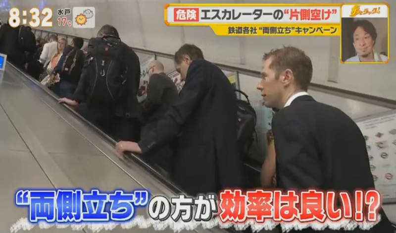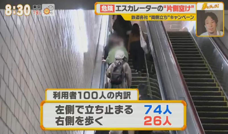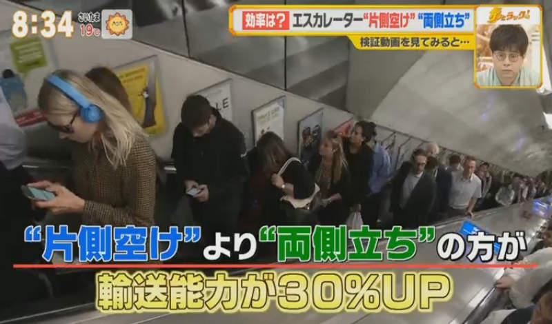 ▼日本TBS電視台在通勤時間到車站觀察,結果發現神奈川縣橫濱市某車站:100人當中有44人站著,56人用走的;