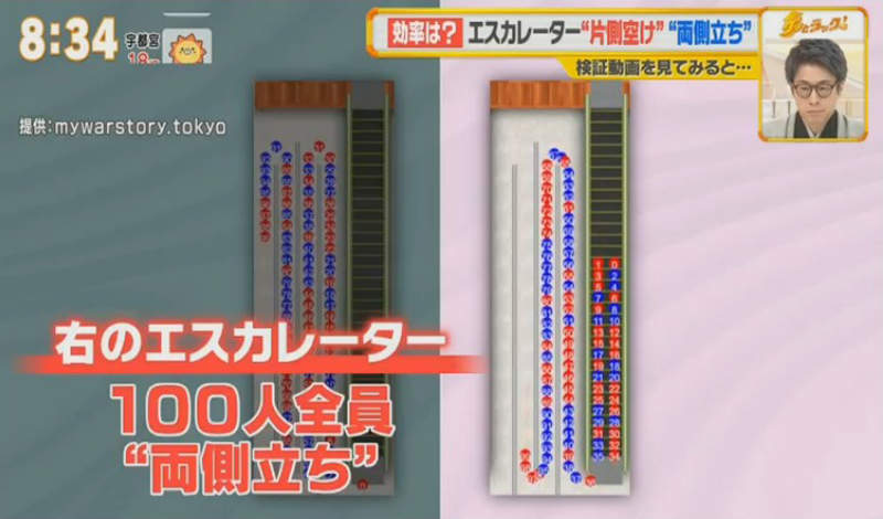 ▼如果手扶梯讓100位乘客全部分站兩邊,另一個手扶梯讓50位乘客站一邊,另外50位乘客用走的,結果顯示兩側都站人的效率比較高!