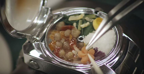 ▼將豐富的食材裝入小小的腕錶中,不是一件簡單的事。Bento找來手工製作腕錶的大師,來製作這款腕錶便當盒;食材部分交給技藝精湛的外科醫生;最後的烹飪環節,則由日本著名的中華料理大師負責。