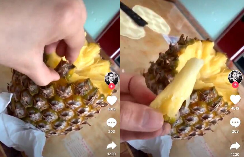 ▼從網路上流傳的影片中可以看到,鳳梨根本不用削皮或是切開,只需要沿著表皮上一個個的凸起,用力一拔就可以拔出一小塊。