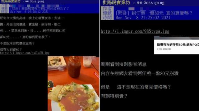 這位網友在PTT發文說,他6日晚去逛瑞豐夜市,看到一攤賣生蠔、蚵仔煎、蝦仁煎,但沒有寫價錢,於是向老闆索取菜單。沒想到這小吃竟然要價80元。