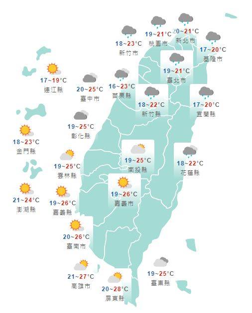 ▼溫度方面,中部以北及宜花預測低溫約15至17度,南部及台東在17至19度之間,中部以北局部空曠地區溫度會再低1至2度,白天高溫北部及宜花約23至25度,中南部及台東約26至29度,日夜溫差較大。