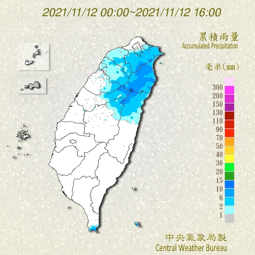 2021年11月12日昨日(11日)受東北季風及輻射冷卻作用影響,北部氣溫偏低,局部地區低溫不到10度。今天(12日)仍有輻射冷卻影響,但不如昨日明顯,而且水氣逐漸增多。明天(13日)是一週當中水氣最多的時候,北部、東部及中部山區有局部短暫雨,基隆北海岸及東北部地區容易有局部較大雨勢出現,可能會持續降雨到下週三(17日)。