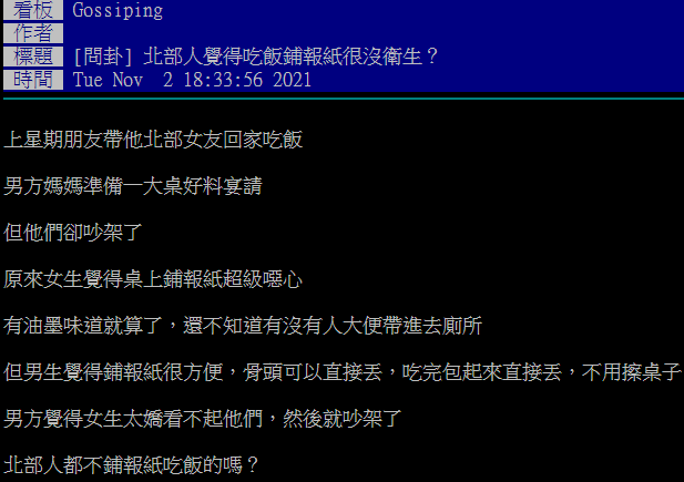 2021年11月13日日前一名網友在論壇PTT八卦版發文詢問:「北部人覺得吃飯鋪報紙很沒衛生?」原來他的朋友帶北部女友回南部家中吃飯,朋友的母親為了招待客人,準備了豐富的菜餚。但女友看到餐桌上鋪滿報紙,聞到飯菜味中混雜油墨味道,感覺「超級噁心」。這對小情侶為此大吵一架,原po非常好奇,北部人覺得吃飯鋪報紙不衛生嗎?