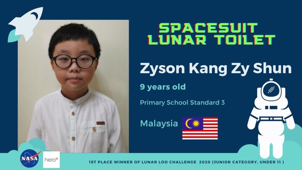 ▼簡子迅憑借「太空人月球馬桶」,在2020年月球挑戰賽(青少年組)中贏過來自85個國家的897名參賽者。他從6月開始著手這一項目,8月時將模型交給NASA進行評估。10月底,NASA邀請他在網路研討會上介紹這一模型,並對這一發明讚譽有加。