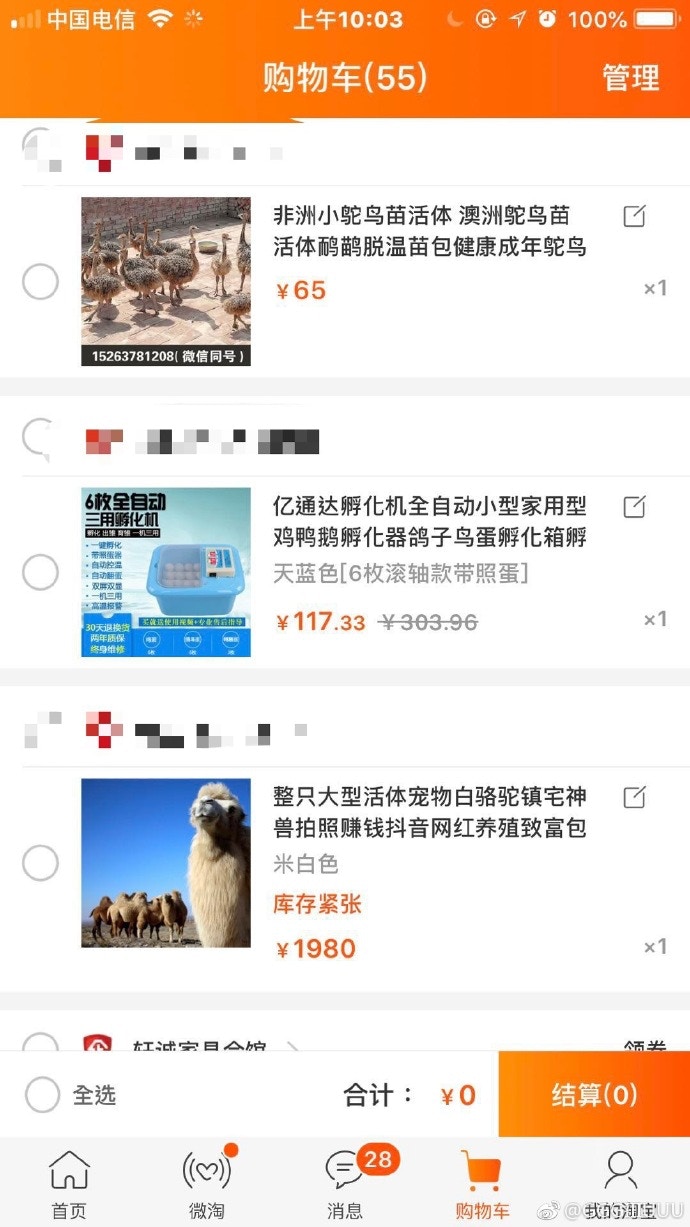 ▼他的購物車中有不少小動物的連結,還有一些很瘋狂的東西,比如500kg重的炒鍋、火雞、大耳山羊、蜂王、飛機等等。那晚他喝多了,不小心誤點,這才買下了藍孔雀、小香豬和娃娃魚。