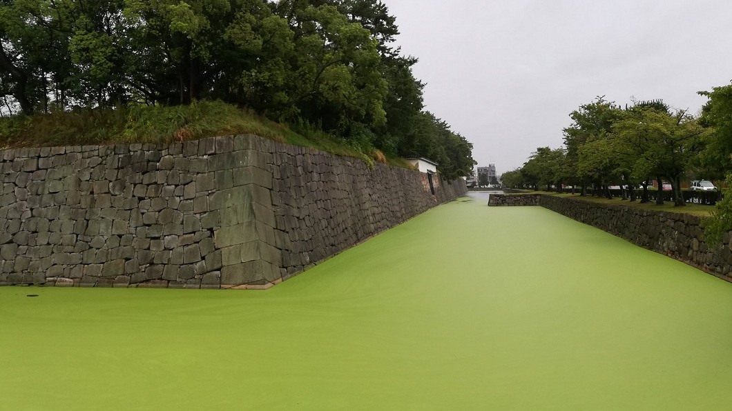 ▼二條城的護城河變成「抹茶奶綠」,當地相關單位猜測,可能是浮草繁殖過多造成的。雖然近2、3年沒有出現過這樣的情況,但過去是曾發生過類似情形的,只是通常在夏季發生,進入秋冬水草就會自然退去。近年來氣候異常,很難預測之後的情況。