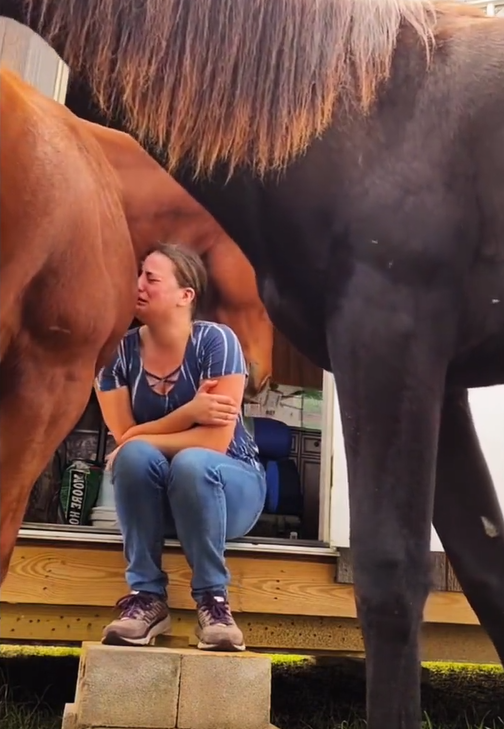 ▼從影片中可以看到,這名女員工獨自坐在角落,抱著雙臂默默流淚。她的表情非常難過。一旁的紅棕色馬兒好像知道發生了什麼事,主動靠近用下巴推了推她的背,讓她可以靠在自己身上。雖然馬兒不能說安慰的話,但牠溫柔的舉動還是讓人覺得非常溫暖。