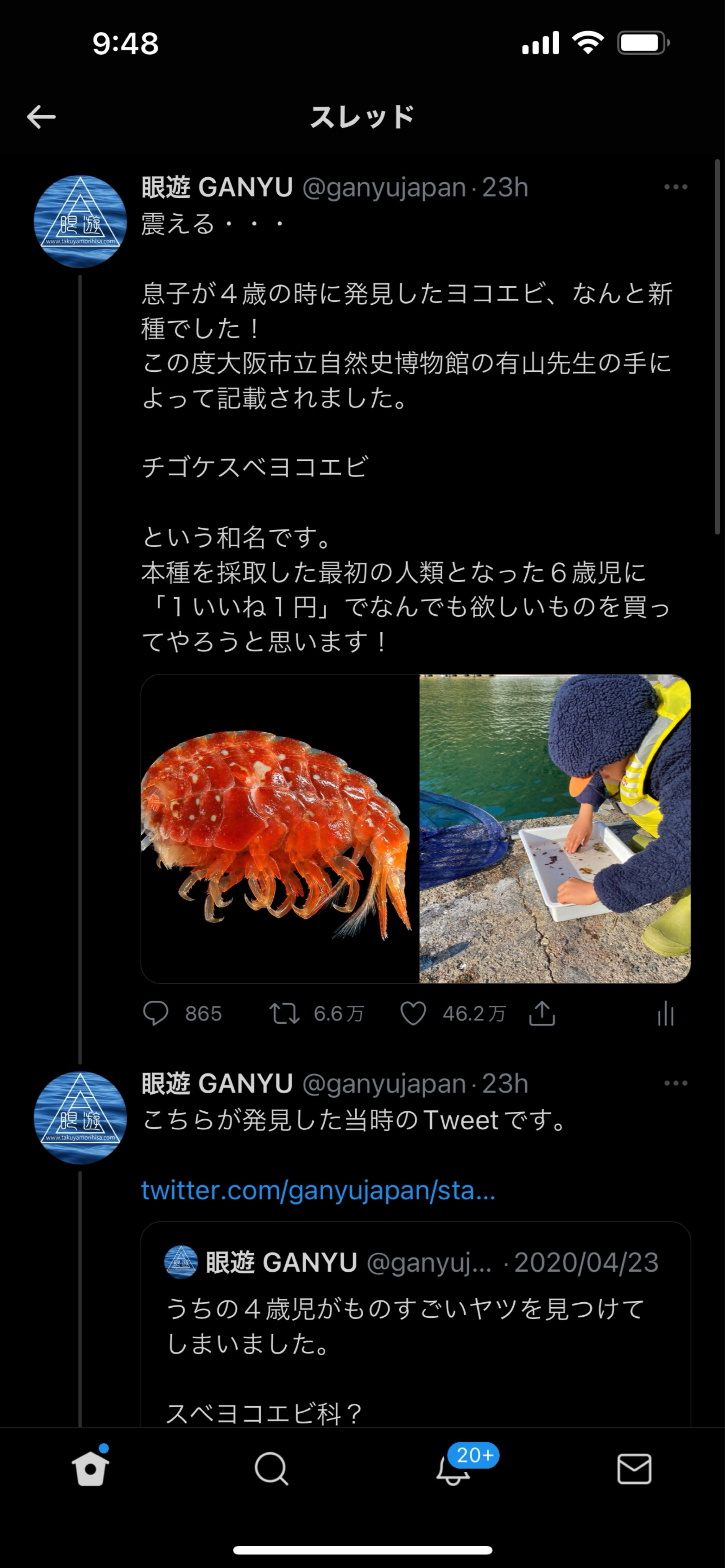 ▼森久拓也為兒子感到驕傲,他決定好好獎勵兒子:「太震驚了……兒子在4歲的時候發現的蝦子竟然是新品種!多虧大阪市立自然史博物館的有山老師,協助新品種登錄。日文名字取為『チゴケスベヨコエビ』。現年6歲的兒子作為第一個採集這個新品種的人類,這篇文章每收到1個讚就會換算成1日圓,讓他買任何想要買的東西!」