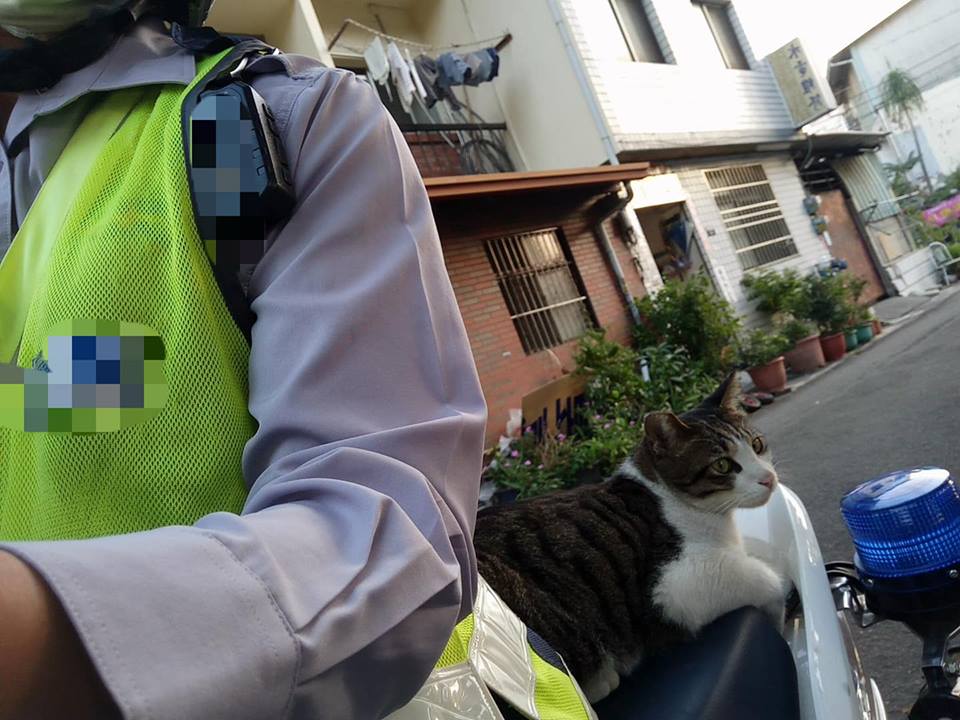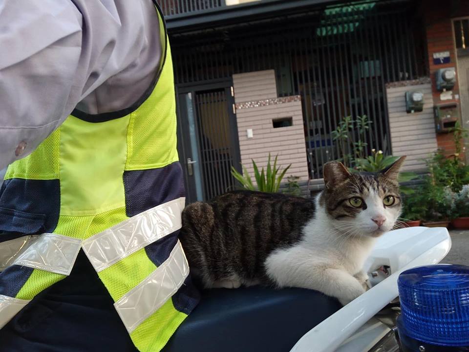 ▼那天陳威良巡邏途中遇到了一隻可愛的貓咪。他忍不住停車,摸了貓咪兩下。沒想到那隻貓咪把這當成了邀請,乾脆利落跳上他的車後座,還趴好趴滿,堅決不下來。