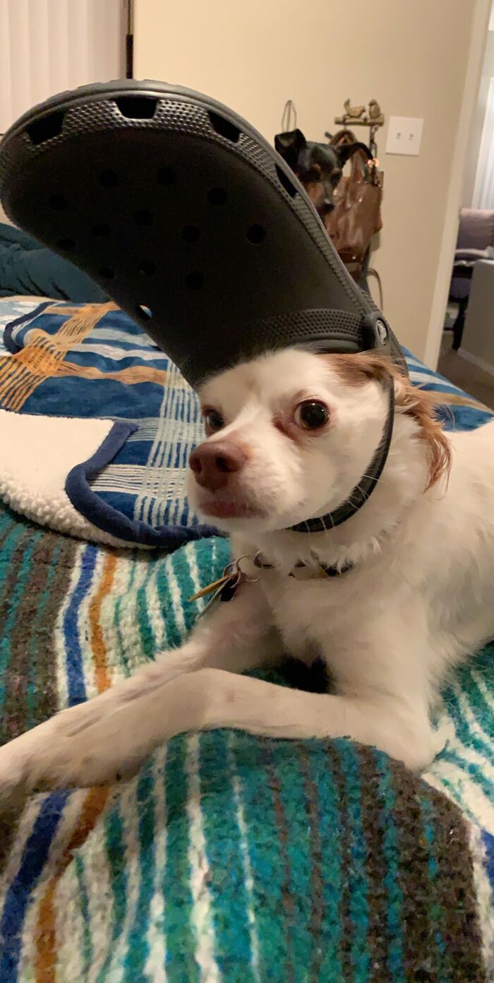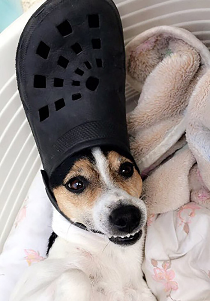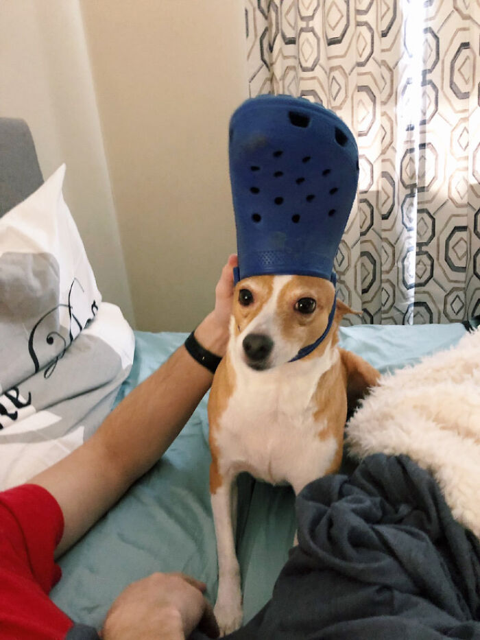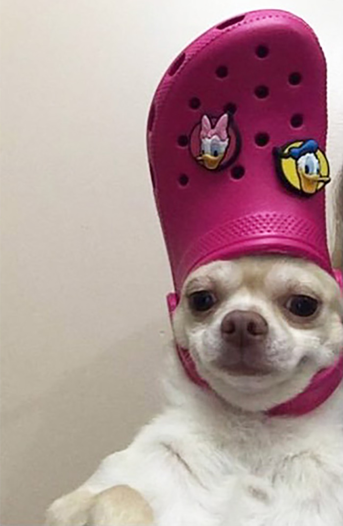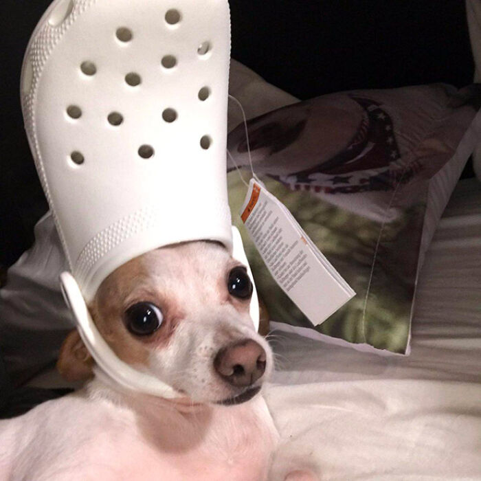 ▼最適合套在毛孩頭上的拖鞋,就是醜到引發討論的洞洞鞋。這種鞋子材質比較硬,再加上形狀合適,鞋帶還能起到固定的作用,真是為毛孩量身設計的!