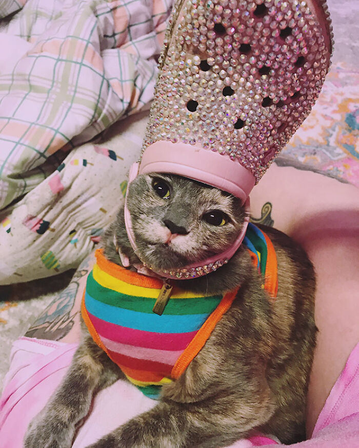 ▼教宗在禮儀上會配戴主教冠。高冷的貓咪將拖鞋套在頭上後,瞬間變成威嚴的貓咪教宗,看起來非常可愛。
