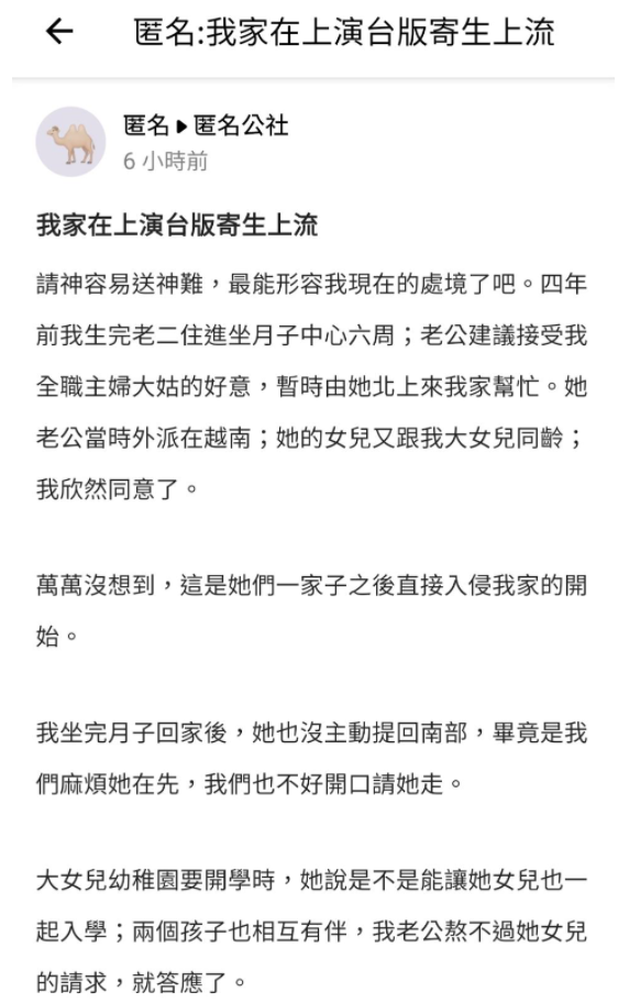 原po表示,3年前她生下二胎,在月子中心住了6週。大姑是全職主婦,老公就建議找她來幫忙。當時大姑的老公外派在越南工作,大姑的女兒又跟原po的大女兒同齡,原po欣然同意,於是大姑母女住進了原po家。沒想到這竟成為了大姑一家入侵原po家的開始。