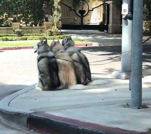 ▼一位網友開車途中,遠遠看見三隻哈士奇並排蹲在路口,身後是牽著牠們的主人,看起來像是在等人,主人正在玩手機,三小隻就靜靜的蹲著一動也不動。