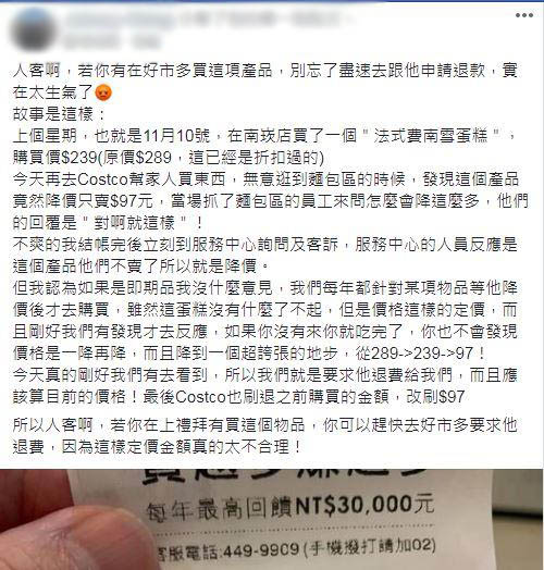 2021年11月23日商品的價格有升有降,這是大家都知道的事。但一名網友卻在臉書社團「爆料公社」po文說,他之前去好市多買了一款蛋糕,9天後再去發現竟然降價了。他認為好市多定價不合理,害他買到貴的,於是跑去要求退費。網友們看到後忍不住感嘆:「奧客不是處處有,但,好市多最多!」