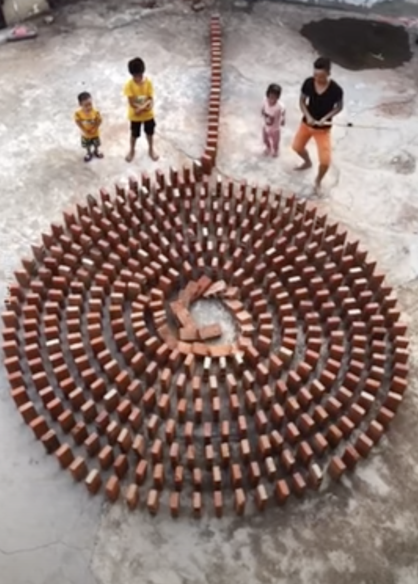▼推倒骨牌非常簡單,但排列時卻要花費時間和心力,稍有不慎就要從頭再來。所有的磚塊都倒下後,那名男子和孩子們忍不住歡呼起來,只看影片就能感受到他們的歡樂。