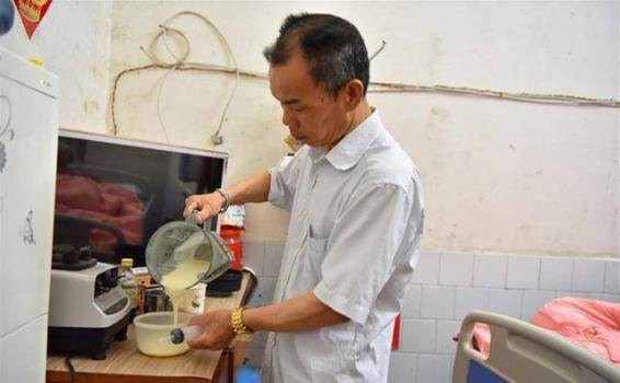 ▼每天早上天不亮,農賢華就要起床,為91歲的老母親、85歲的岳母和83歲的岳父準備早飯。照顧3位老人吃過早餐,他還要為癱瘓的岳父擦洗、餵藥、按摩,然後騎著腳踏車去上班。這樣的生活農賢華已經過了12年。
