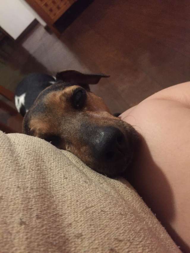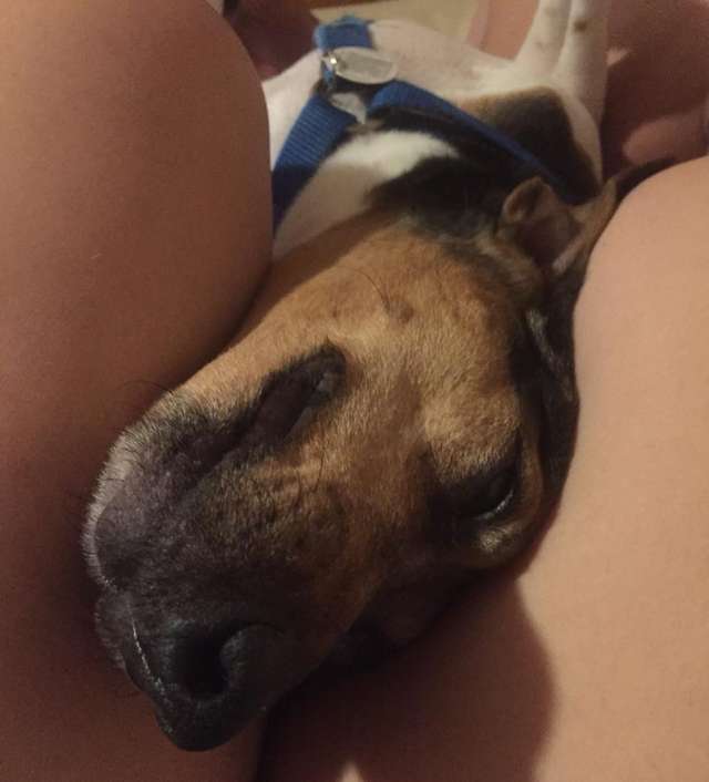 ▼Jake不願意自己待著,總想跟在家人身邊。牠健康時,一抬頭就能找到家人的身影,現在看不見了,該怎麼辦呢?牠就跑到家人旁邊,把頭放在家人的膝蓋上。