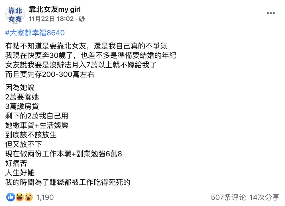 ▼女友已經想好結婚後7萬月薪該如何分配:其中2萬元拿來養她、3萬元繳房貸、剩下的2萬元留給原po自用。女友自己的收入則拿來繳車貸與生活娛樂。原po現在月收入勉強到6萬8,卻是做兩份正職加上副業才有的。他無奈表示:「我的時間為了賺錢都被工作吃掉了!」