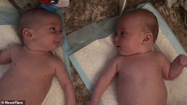 ▼Archie和Freddie躺在墊子上看著彼此,他們非常興奮,臉上帶著微笑,還用神秘的寶寶語聊天,不時發出笑聲。Archie很想跟兄弟交流,咿咿呀呀說個不停,Freddie則耐心傾聽,並一臉好奇看著對方。