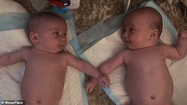 娘胎裡就認得!4個月雙胞胎「初見彼此」 手舞足蹈爸媽笑:超能聊~